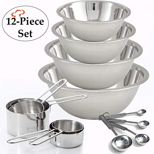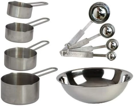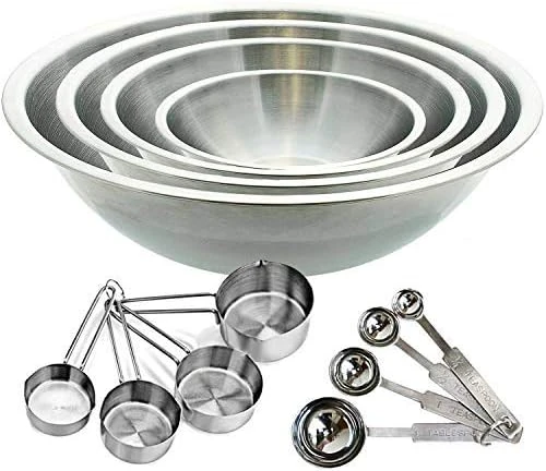 - SET INCLUDES: 4 heavy-duty stainless steel measuring cups, ¼ cup, 1/3 cup, ½ cup and 1 cup. 4 heavy-duty stainless steel spoons, 1 Tbsp, 1 Tsp, ½ Tsp, ¼ Tsp. and 1 1/5 qt, 3 qt, 4 qt and 5 qt stainless steel mixing bowl.