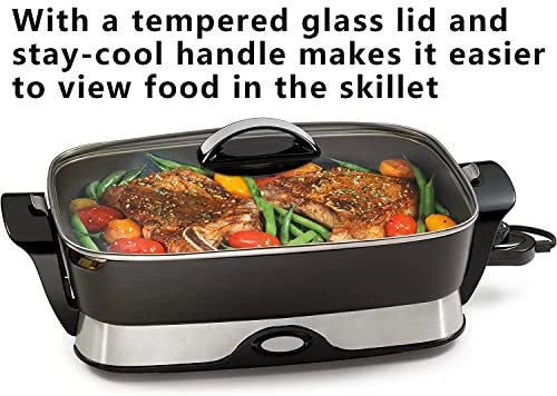 - electric skillets nonstick with lids:Tempered glass lid and stay-cool handle allow the skillet to be used as buffetware. Large 16″ base and high sidewalls provide additional cooking and serving capacity