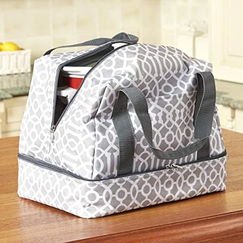 - Sturdy materials make up this double-compartment food dish carrier and also keeps the contents around a desired temperature. Zipper closures keeps the contents secure.