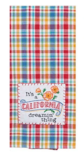 - The coordinating red, yellow, blue and green plaid tea towel features a stitched panel with the state flower and the sentiment ‘It’s an California dreamin thing’