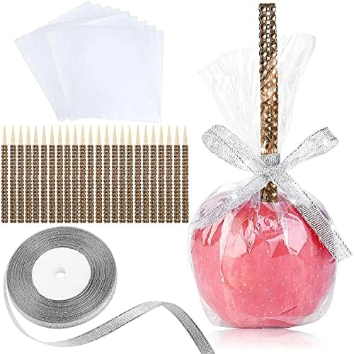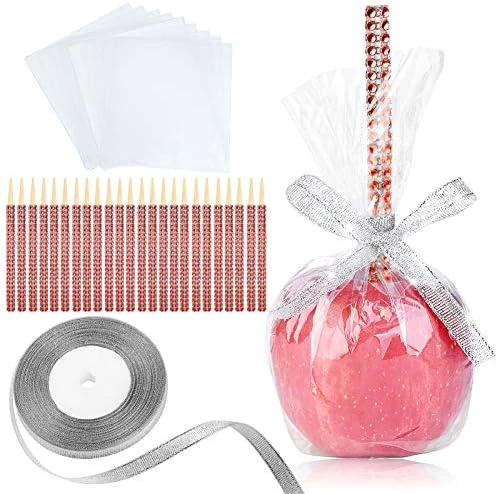 - VALUABLE SET: This set comes with 24 food-safe plastic glass bags, provide a clear look of your cute candy apple. Also, contain one sophisticated ribbon roll with a perfect combination of softness and shine. This set will be great for any outdoor activities, secure your candy apple from any dust or insect.