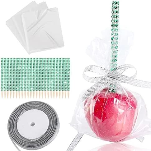 - PACKAGE INCLUDED: This package included 24 wrapped sticks, 24 glass paper bags, and 1 roll of glitter ribbon. The plastic bag included in the package is bigger than the apple to make it easier for you to assemble them, you can use a scissor to trim it.