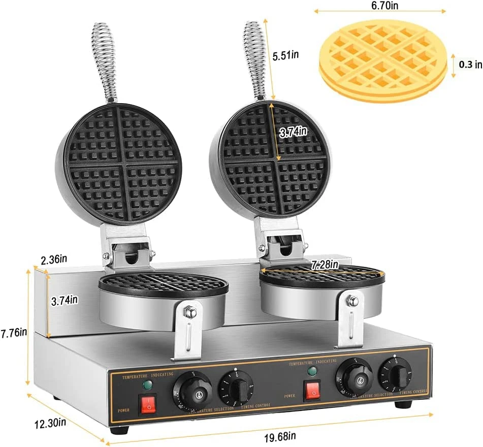 - 【Commercial Waffle Maker】This is a double waffle stove for making delicious waffles for you. Waffle makers are well suited to quickly make delicious round Belgian waffles for family members or business parties. You can add chocolate and jam to the soft and delicious waffles according to your idea to enrich the taste of waffles. It is a great choice for making waffles in restaurants, school canteens and family gatherings.