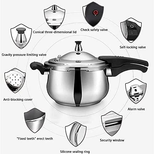 - ❤ Nine-fold safety and worry-free, conical three-dimensional pot lid, stop safety valve, gravity pressure limiting valve, self-locking valve, anti-blocking cover, alarm valve, “fixed teeth” standing teeth, safety window, silicone sealing ring.