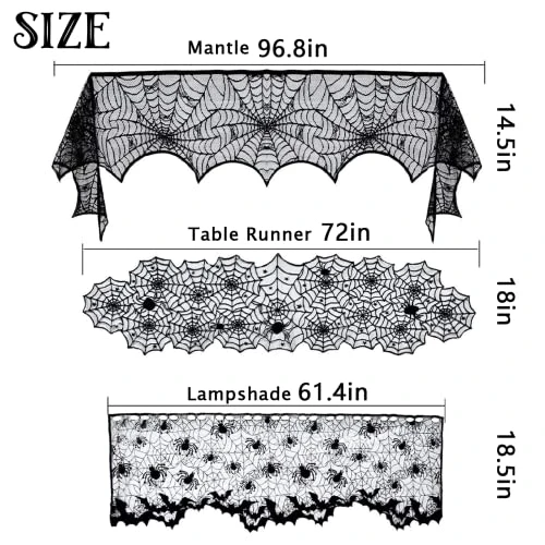 - Popular Size: Fireplace Mantel Scarf (96.8″x14.5″), Lace Rectangular Table Runner (18″x72″), Lace Round Table Topper (40″DIA), Lampshade Cover (61.4″x18.5″), Creepy Cloth (157″x30″), Bats in 4 different sizes and Black roses (16.5″). Set the mood for your home with the considerable size Halloween decor.