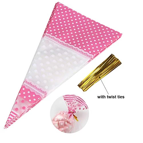 - Each pack of cone cellophane bags comes with over 50 twist ties. They are golden, decorate the bags well and make the bags more beautiful and funny.