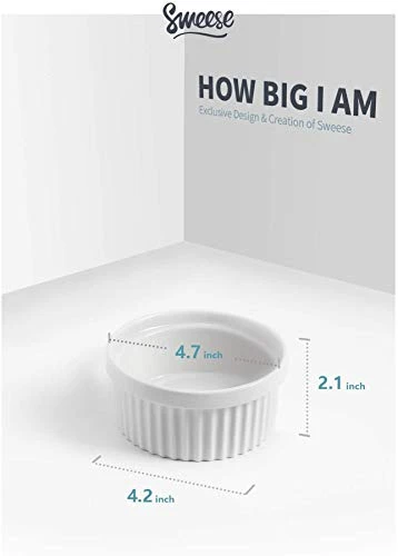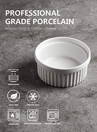 - HIGH-QUALITY PORCELAIN & SAFE TO USE – Sweese creme brulee ramekins are very sturdy and affordable. Made from white glazed porcelain( LEAD & CADMIUM FREE), can stand the highest temperatures in your oven and even the lowest setting in your freezer. WON’T ABSORB ODORS, FLAVORS OR COLORS. Never worry about harmful toxins leaching into your food. Safe to use around your family. And they are MICROWAVE SAFE, OVEN SAFE, FREEZER SAFE, DISHWASHER SAFE, BROILER SAFE.