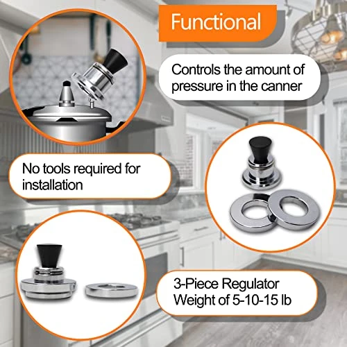 - 【Convenient Function】With the adjustable 3-piece regulator, the pressure cooker weight is a great help to control the amount of pressure in the canner. And it’s convenient to mantain the correct pressure, so you no longer need to sit in front of the stove, watching the gauge like a hawk, more convenient & energy efficient. Great replacement for presto canner weight.