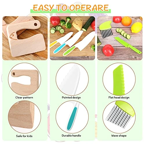 - 🍌Materials: The toddler knive is made of wooden, the safe knives are made of plastic, and the knife which cut potatoes is made of iron and plastic.These kids kitchen tools are mainly made of plastic and wood materials, which are reliable, long-lasting, not easy to break or deform, can give you a good using experience.