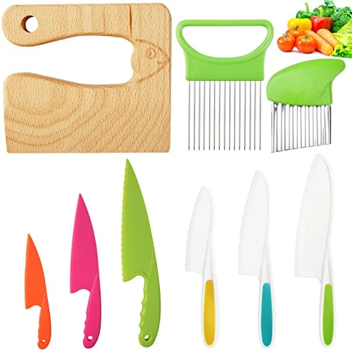 - 🔪Healthy Material:These wooden children’s kitchen tools are mainly made of plastic and wood materials, BPA free, carefully polished and won’t hurt your kids’ finger, the onion cutting tool and french fry slicer are made of quality stainless steel and plastic, long lasting and not easy to break, can give you a good using experience.