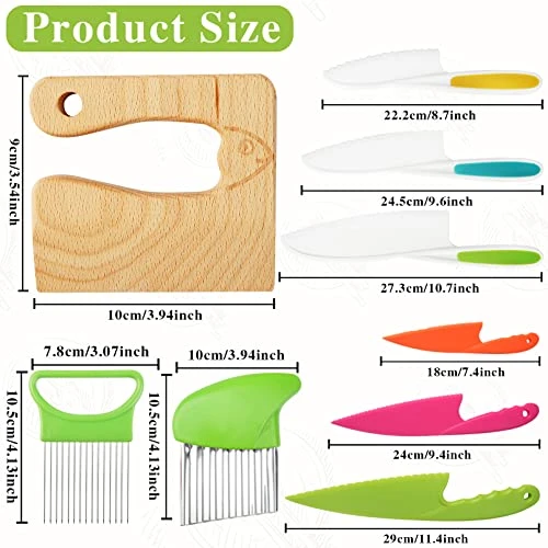 - 🔪Proper Size:serrated edges toddler knives come in 6 sizes, respectively are 10.7 x 2.2 inch, 9.6 x 2 inch, 8.7 x 1.7 inch,11.4 x 2.2 inch,9.4 x 1.8 inch,7.4 x 1.4 inch,wood knife size is 3.94 x 3.54inch,the onion cutter holder is 4.13 x 3.07 inch, plastic potato cutter is about 3.94 x 4.3inch,The perfect size for you and your little chef to enjoy a great cooking time in the kitchen.