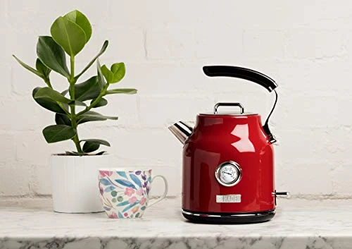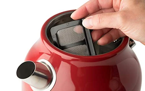 - DESIGNED WITH A VARIETY OF FEATURES: Includes a retro temperature gauge, a convenient water-fill window, a power light indicator for when water boils, and a spare filter; Perfect for preparing your favorite tea or water for coffee at any time