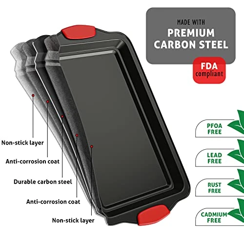 - SILICONE HANDLES: Red silicone grips on our oven pan set ensure a comfortable grasp. Our small, medium, and large cookie sheets for baking, nonstick set is BPA-free and PTFE/PFOA/PFOS-free.