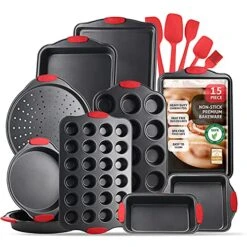- 15-PIECE BAKING PANS SET NONSTICK: Whip up your favorite baked goods with our small, medium, and large baking sheets for oven, nonstick set of 3; plus a pizza pan, loaf pan, square pan, 2 round pans, 12 & 24 cup muffin pans, and 5 silicone spatulas.