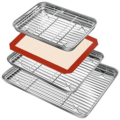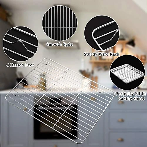 - HEALTH MATERIALS – Wire rack with baking sheet set are built with premium food grade stainless steel, without any chemical coating, rust free and durable for long-lasting. Baking sheet set has superior mirror finish to reduce the risk of food sticking. Baking rack provide ample airflow for even cooking, cooling also prevent food from falling.