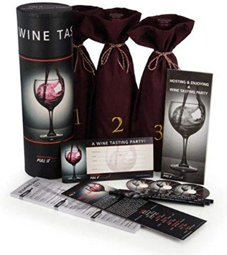 Turn their next party into a first-class event. Wine bottles are slipped into velveteen wine bags. After tasting each wine, guests write their descriptions on scorecards. Even if no one correctly identifies the wine, engaging conversation is guaranteed, and everyone will leave with a better grasp of the facets of wine tasting. Includes 3 velveteen wine bags, wine glass identifiers, 12 pencils, 12 invitations, “Quick Facts” sheet, rating pad. Wine not included.