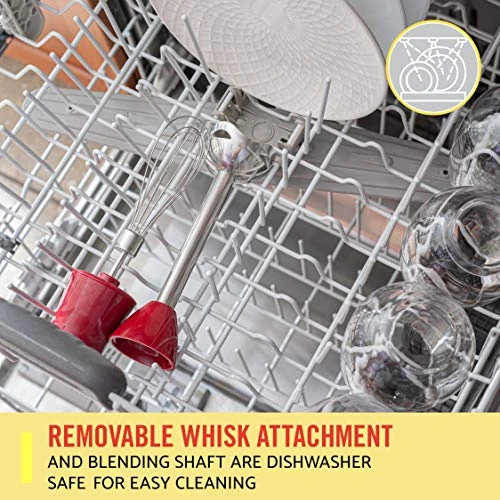 - SIMPLE CLEANUP: Perfect for the smaller kitchen, this handheld blender includes durable & removable dishwasher safe stainless steel blade system & whisk attachment. Ergonomic grip for comfortable use.