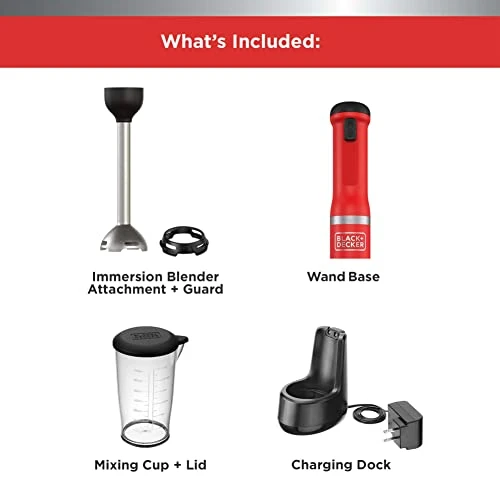- ITEMS INCLUDED: Red wand base, Immersion Blender Attachment, Mixing Cup with Lid, charging Dock + Cord