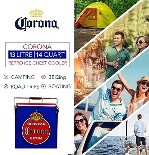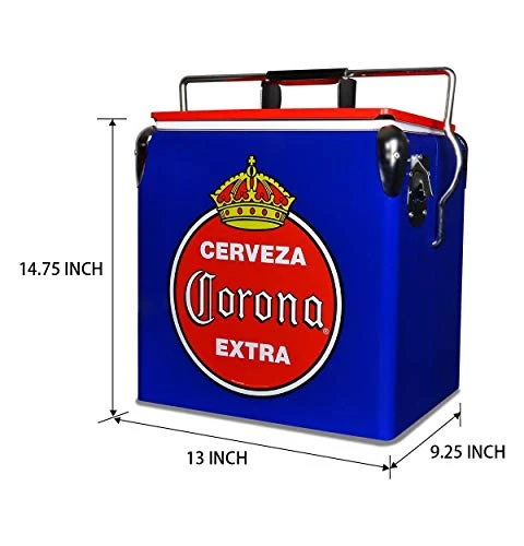 - Perfect Gift for Corona Fans: Unique retro-style cooler with eye-catching blue and red exterior, polished chrome accents, and vintage Corona artwork is the ideal gift for collectors and day-trippers