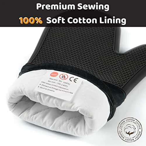 - Oven Mitts Heat Resistant – Up to 581°F, the heavy duty oven mitts are made of thick food-grade silicone and premium 100% soft cotton lining. BPA-FREE. Perfect for cooking and outdoor barbecue