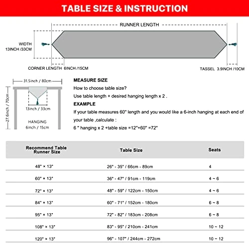 - Runner Size -72×13” (183x33cm) ; Weight: 420g ; Recommended Use for length of table’s size: From 50 – 60 Inches