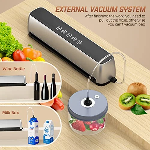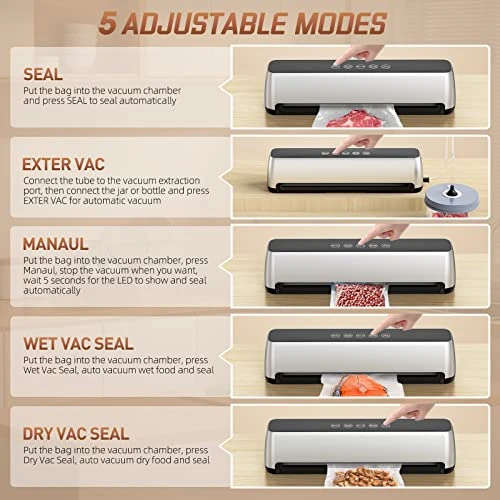 - 【5 Modes & Easy to Use】 – Our food vacuum sealer is operated by automatic one-button sealer. 5 modes : Seal, manual, dry food, wet food and external vacuum mode. LED indicator light, hands-free design, Suitable for meat, seafood, fruits, vegetables, nuts, bread, jars, etc. Compact size and lightweight design, super suitable for beginners, especially the elderly and children. Meet all your needs.