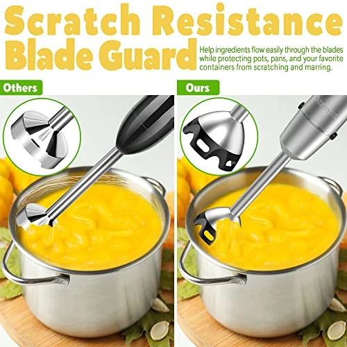 - 💖Scratch Resistance Blade Guard: Most immersion hand blenders on the market don’t always work well with non-stick pans because they can scuff up the coating with their metal blending wands. Enter the BEEWEEL Hand Blender. It has a specially designed bell guard, and a unique bell guard means it won’t scratch the bottom of any pot, pan, or bowl no matter what you’re doing, giving you more peace of mind when cooking.