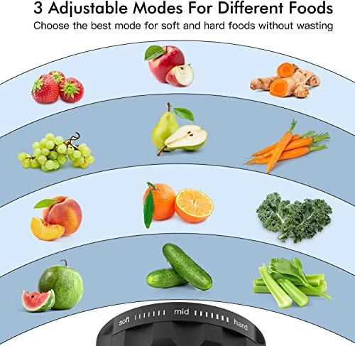 - đă3 Speed Modesă- The juicer machines vegetable and fruit offer 3-speed control options for optimal nutrient extraction. The “SOFT” mode is perfect for soft and juicy produce like watermelons, oranges and tomatoes; the “Mid” mode is great for fibrous fruits and vegetables like celery, cucumbers and apples; and the “HARD” mode works well for harder produce like carrots, beets and pineapple. Enjoy a daily glass of freshly squeezed juice packed with vitamins to keep you energized all day.