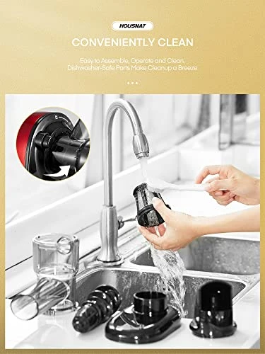 - 👉Easy to Disassemble & Clean👈: One-button assembly design allows you to disassemble the juicer in a few seconds. You can easily disassemble and clean. Reverse function avoids ingredients from getting stuck. Cleaning becomes an easy job with the equipped brush. All detachable parts are made of high-grade food-grade materials and makes cleaning a breeze.
