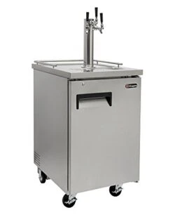 Boasting a complete triple tap dispense system, this versatile Kegco 3PICXCK-1S-3 Three Faucet Commercial Cold-Brew Kegerator is perfect for coffee shops, small restaurants, and office break rooms that want to keep multiple flavors of iced coffee on tap at the same time. It features a spacious interior with a knockout that gives you the option to mount your nitrogen tank outside of the cooler, giving you enough room inside to store up to four 5 gallon ball lock coffee kegs. This javarator can be easily moved thanks to 4″ locking casters, and a built-in drip tray and steel interior make clean-up fast and simple. The 1/7 hp compressor delivers superior cooling, while cold air is fan-forced into the tower to keep your iced coffee cool all the way up to the faucets. This cold brew coffee keg dispenser comes with everything you need to tap up to three ball lock Cornelius kegs, including a three faucet tower with stainless steel faucets and fittings, three sets of ball lock keg couplers for Cornelius home brew kegs, a dual gauge nitrogen regulator with an air distributor, and an aluminum nitrogen tank. One 22 cu.ft. tank can pressurize up to fourteen 5 gallon kegs before needing to be refilled. The faucets are constructed of durable and sanitary stainless steel, and the ball lock keg couplers are made of food grade plastic and have been designed to resist corrosion.