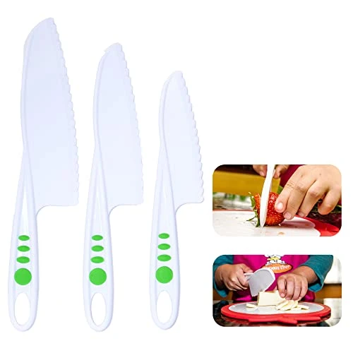 - INCLUDES – The set includes a large knife, medium knife, and small knife, providing all the necessary tools for your little chef to help with cutting tasks in the kitchen. The knives are made with a construction that keeps hands and fingers safe while allowing children to be involved in food preparation. Whether it’s slicing fruits, vegetables or breads, this set will make your child feel like a pro in the kitchen. What a fun way to teach your kids about cooking skills.