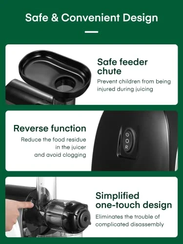 - 【Safe Feeder Chute & Reverse Function】Our safe feeder chute slow juicer prevents children from being injured during juicing. The reverse function helps prevent clogging during juicing, reducing the burden of cleaning. The humanized design allows you and your whole family to make each other’s favorite juice with a fruit juicer every day.