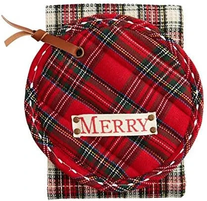 2-piece set. Tartan pot holder features printed twill applique patch. Arrives with coordinating waffle weave towel.