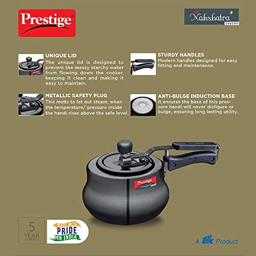 - The Nakshatra Plus Hard Anodised Svachh Pressure Handi is designed to last longer and comes with a unique lid that contains any spillage that might occur during the course of cooking and prevents the messy liquid from dripping down.