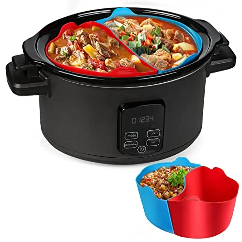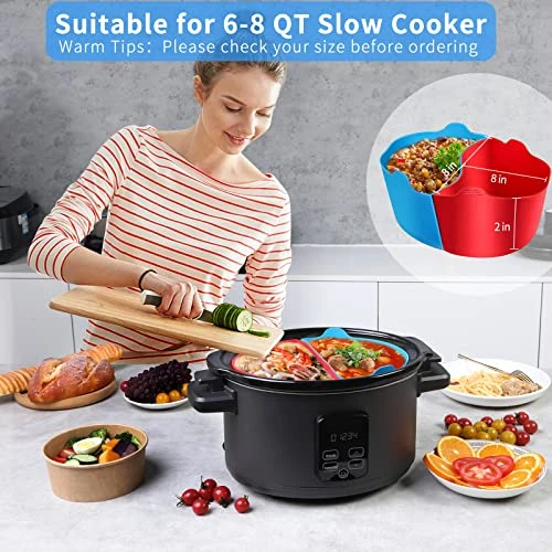 - Fits 6-8 QT Slow Cookers — This reusable silicone slow cooker divider measures 8x8x2 inches and is perfect for 6-8 quart round and oval slow cookers. The innovative design of this slow cooker accessory eliminates the need for traditional plastic and aluminum foil liners. Just throw it in the dishwasher and you’ll have more time to spend with your family