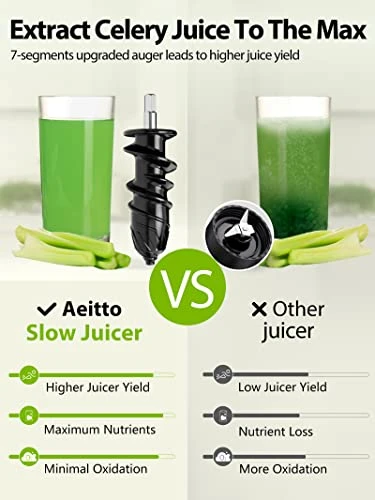 - 🍊【Upgraded Auger & Quiet Operation】-The upgraded auger of the Aeitto Juicer Machines can better increase juicer yield, and the juice can retain more abundant nutrients and reduce oxidation.The motor operates less than 60 decibels.It stop automatically for every 20 minutes’ operation.