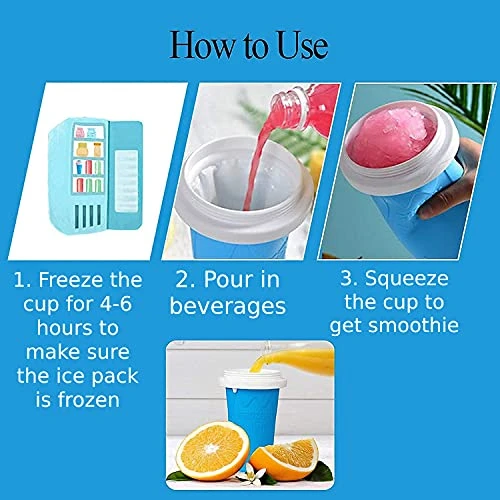 - 🍓【EASY TO USE】Put the cup in the freezer compartment of your refrigerator for 4-5 hours. Then pour the beverages in, wait for a bit and squeeze it out to get your fresh and delicious smoothie.