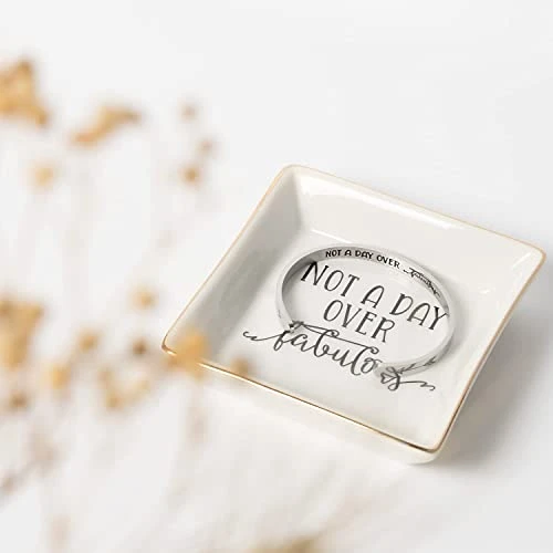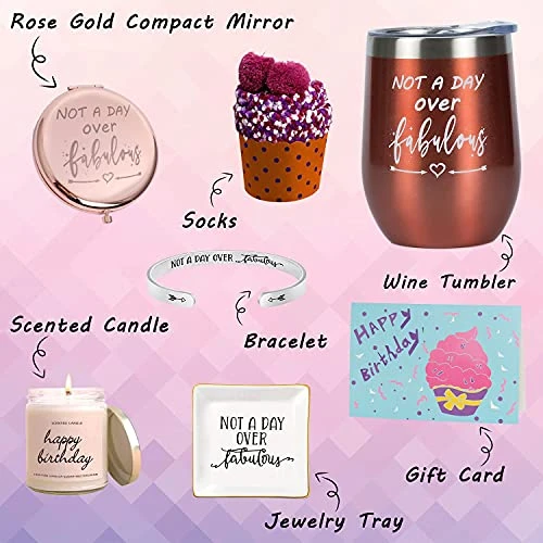 - WHAT’S INSIDE? 1) 1 candle with 2 sides printed. 100% soy vanilla cake candle – smells so delicious, she’ll want to eat it! 2) Inspirational engraved bracelet 3) Not a day over fabulous jewelry dish 4) Rose gold insulated 12 oz wine glass 5) Super soft purple Pom Pom socks, given as cupcakes 6) “Not a day over fabulous” compact mirror in rose gold 7) Birthday card (write your well wishes)
