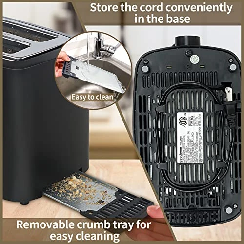 - Easy Operation & Cleaning: The precise knob will take you to the correct settings. Flexible lift lever for smooth dropping and auto ejecting of bread. Removable crumb tray helps you collect and dump falling crumbs to avoid staining your desktop.