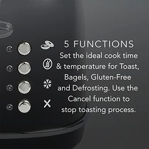 - 5 TOASTER FUNCTIONS – Ideal cook time & temperature for Toast, Bagels, Gluten-Free and Defrosting, use the Cancel function to stop toasting process