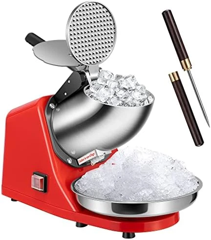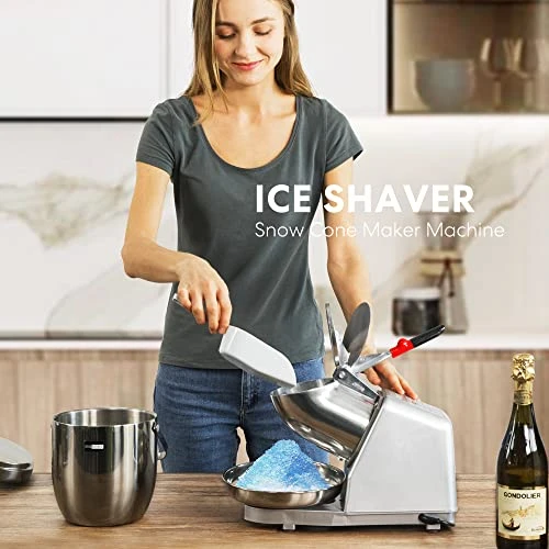 - SMART DESIGN – Our waterproof “on/off” switch guarantees safety, convenience, and peace of mind; Blades stop rotating and the power shuts off automatically when the hopper handle is open to avoid injury; The roller on the outlet is helpful to prevent ice from splashing, giving you an enjoyable ice-making experience