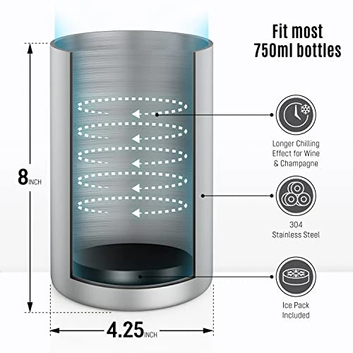 - Made Of Stainless Steel – Each wine bottle chiller is made of high-quality stainless steel with a satin surface. The wine chiller cooler bucket is not only durable and sturdy, but also easy to clean and lightweight.