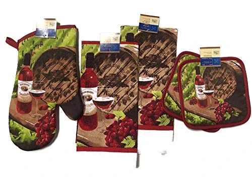 Wine Glass Bottle Barrel Kitchen Linen Set (Includes: One Oven Mitt, Two Towels, And Two Pot Holders)